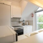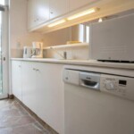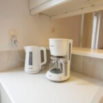 Fridge, cooker, oven, microwave oven, coffee maker, sandwich maker, dishwasher.